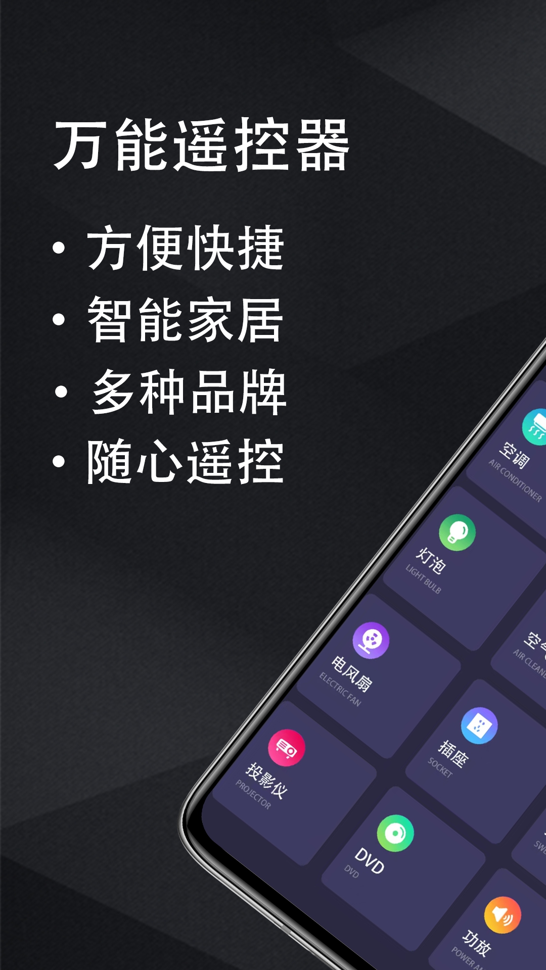 一款电视遥控器空调遥控器红外遥控软件 1.应用内界面直观,没有按钮堆积或复杂的设置。让您不论是看电影、听音乐、吹空调都变得更加简单 2.摆脱找不到遥控器的烦恼,让您更加喜欢您的家电设备 3.海量遥控数据库:匹配各种型号各种品牌,不再受品牌约束;多种遥控类型:支持空调、电视、机顶盒、投影仪等常见设备; 4.多品牌空调家电支持;轻松添加遥控器,红外支持,一部手机,遥控所有家电,支持智能家居,空调遥控器、电视遥控器、风扇遥控器、空气净化器遥控器、DVD遥控器、功放遥控器、投影仪遥控器等数十种家电,再也不用到处找遥控器了。 5.只要有手机就能遥控!支持快速添加电器品牌/型号等,再不用对着数十套遥控器数据逐一匹配。 6.如您的手机没有红外功能,也可接上外置红外发射器配件让手机遥控更轻松!
